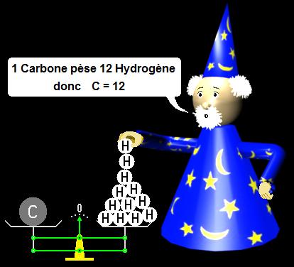 Il a comparé la masse du carbone par rapport à la masse de l'hydrogène et s'est apperçu que le carbone était 12 fois plus lourd. Il a donc écrit C = 12. De même avec l'oxygène qui était 16 fois plus lourd que l'hydrogène, il a écrit O = 16, et ainsi de suite avec tous les éléments qu'il connaissait. Au final avec les éléments connus à l'époque, sa liste ressemblait donc à ceci : |