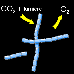 Des bactéries, puis des algues bleues grâce à la photosynthèse commencent à produire du dioxygène en consommant le dioxyde de carbone. La vie commence dans les océans. |