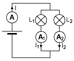 | Dans un circuit en dérivation, l'intensité du courant électrique sortant de la pile est égal à la somme des courants passant dans chaque lampe. |