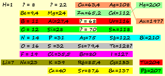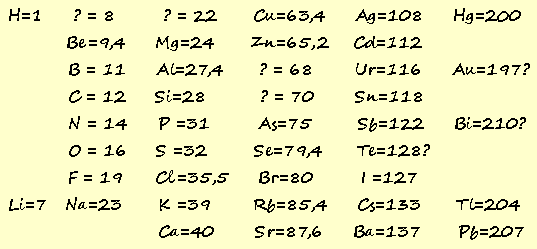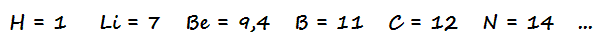 Il a comparé la masse du carbone par rapport à la masse de l'hydrogène et s'est apperçu que le carbone était 12 fois plus lourd. Il a donc écrit C = 12. De même avec l'oxygène qui était 16 fois plus lourd que l'hydrogène, il a écrit O = 16, et ainsi de suite avec tous les éléments qu'il connaissait. Au final avec les éléments connus à l'époque, sa liste ressemblait donc à ceci : |