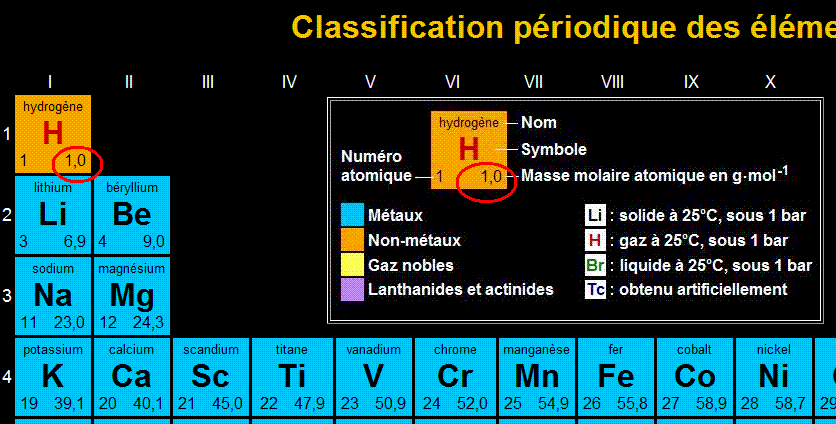 Nous lisons dans le tableau que l'atome d'hydrogène a une masse molaire atomique de 1,0 g.mol-1. Nous écrivons : M(H) = 1,0 g.mol-1