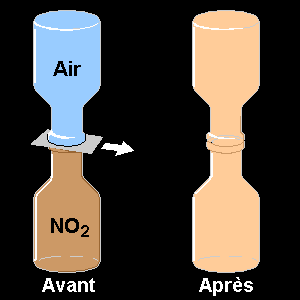 Dans un gaz, les molécules sont très éloignées les unes des autres. Elles sont animées de mouvements permanents, et se heurtent et rebondissent sur les parois du récipient qui contient le gaz. |